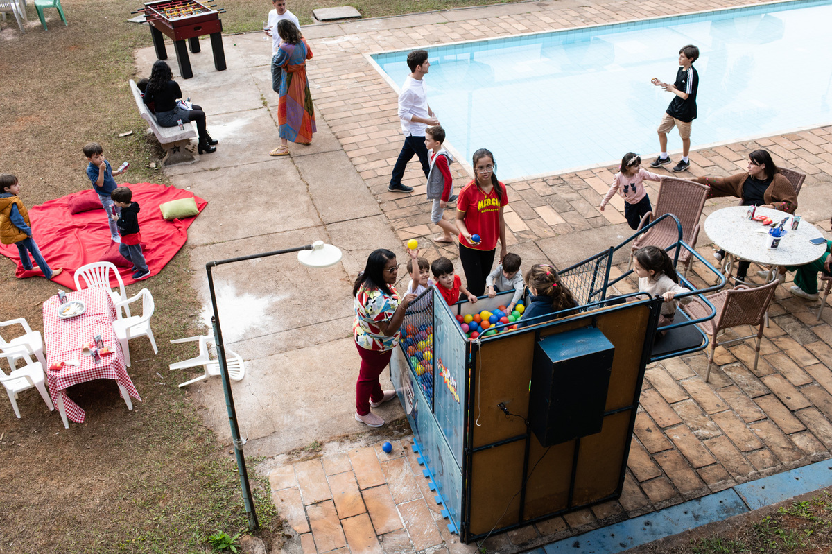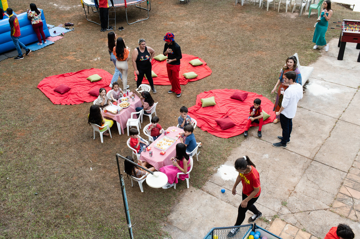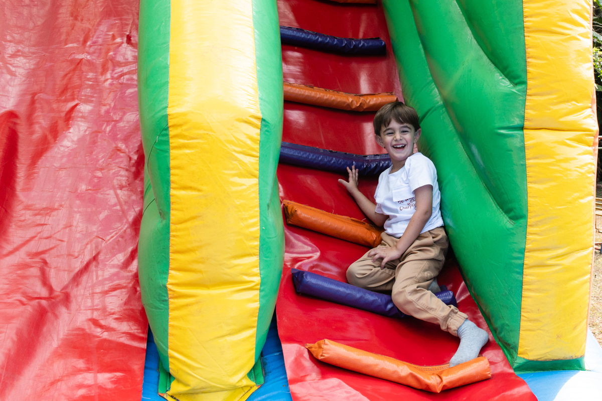 Apesar do friozinho, o dia estava lindo e cheio de pessoas maravilhosas. As crianças se divertiram muito com diversas brincadeiras, enquanto os adultos aproveitavam as bebidas, música boa e a deliciosa carne assada na brasa. Todos estavam reunidos para comemorar o quarto aniversário do Lucas, e de quebra, os 50 anos do pais dele.
